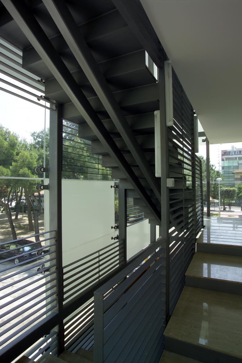 - la distribuzione verticale, al fine di rendere fruibile il piano terra senza soluzione di continuità, è stata posta in testata diventando essa stessa prospetto (principale) e mettendo in scena il sistema dei flussi dell’edificio;