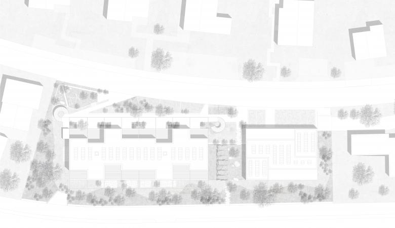 Der Freiraum zeichnet sich aus durch eine klare Erschliessung des Neu- und Umbaus. Eine lange Sitzbank liegt parallel zum Eingangsbereich des Wohnbaus und fängt die Hangkante zum Bitziberg auf. Im Zwischenbereich der beiden Bauten befindet sich ein Gemeinschaftsplatz für Spiel und Aufenthalt. Eine filigrane Pergola spendet Schatten und bildet einen Filter zum Erdgeschoss. Die privaten Aussenbereiche werden durch eine spezifischen Betonplattenbelag im Schottischen Verband ausgebildet. Ein weiterer Spielbereich mit robusten naturnahen Spielelementen liegt am nördlichen Rand der Parzelle. Zartblühende Gehölze, Kiefern und graublaubige Sträucher zeichnen das Vegetationsbild und umhüllen die Bauten. Eine üppige Staudenbepflanzung entwickelt sich in den steileren Partien zu einer vielfältigen Blumenwiese.