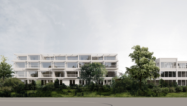 Die L-Förmige Figur des 1. Obergeschosses wird wie das bestehende Erdgeschoss zu einem kompakten Rechteck ergänzt. Markante Dachaufbauten gliedern das Volumen. Eine filigrane Stahlkonstruktion ist dem Volumen auf beiden Längsseiten vorgesetzt, die als begrünten Aussen- und Erschliessungsraum dient. Auf der Westseite ist die Stahlkonstruktion als hängendes, poröses Fachwerk ausgebildet das zueinander versetzte Balkone und feste Pergolen integriert. Auf der Ostseite zum Bitziberg hin dient die Stahlkonstruktion als Erschliessung des ersten Obergeschosses sowie als Schattenspender der Vorgärten der Wohnungen im Erdgeschoss. Seitlich, stellen zwei gewundene Treppen die vertikale Erschliessung über den Laubengang sicher.