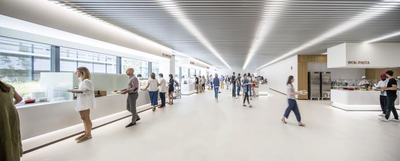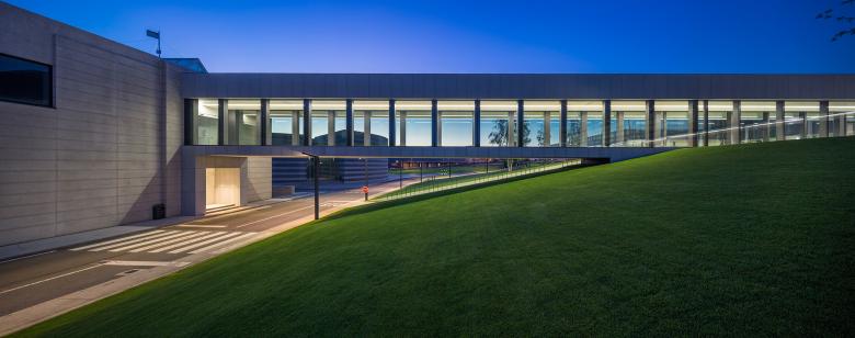 The extension of the Headquarters, with 70,000 m² of built area, reorganises and brings coherence to the rest of the complex. The proposal extends existing connections through a “cloister-like” layout, reinterpreted with bridges that span the internal street, creating covered pedestrian routes protected from the rain.