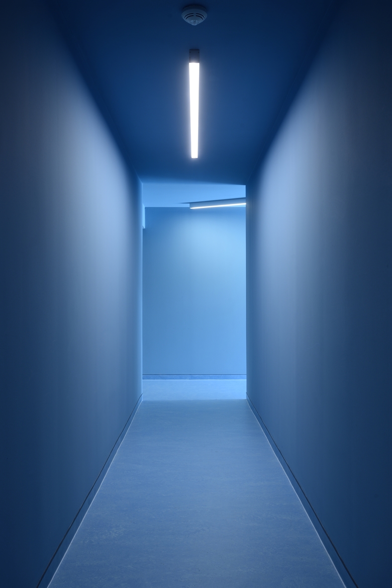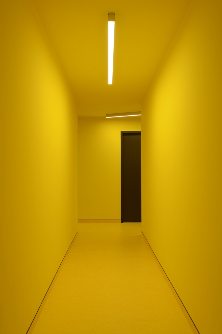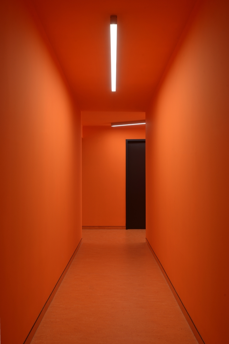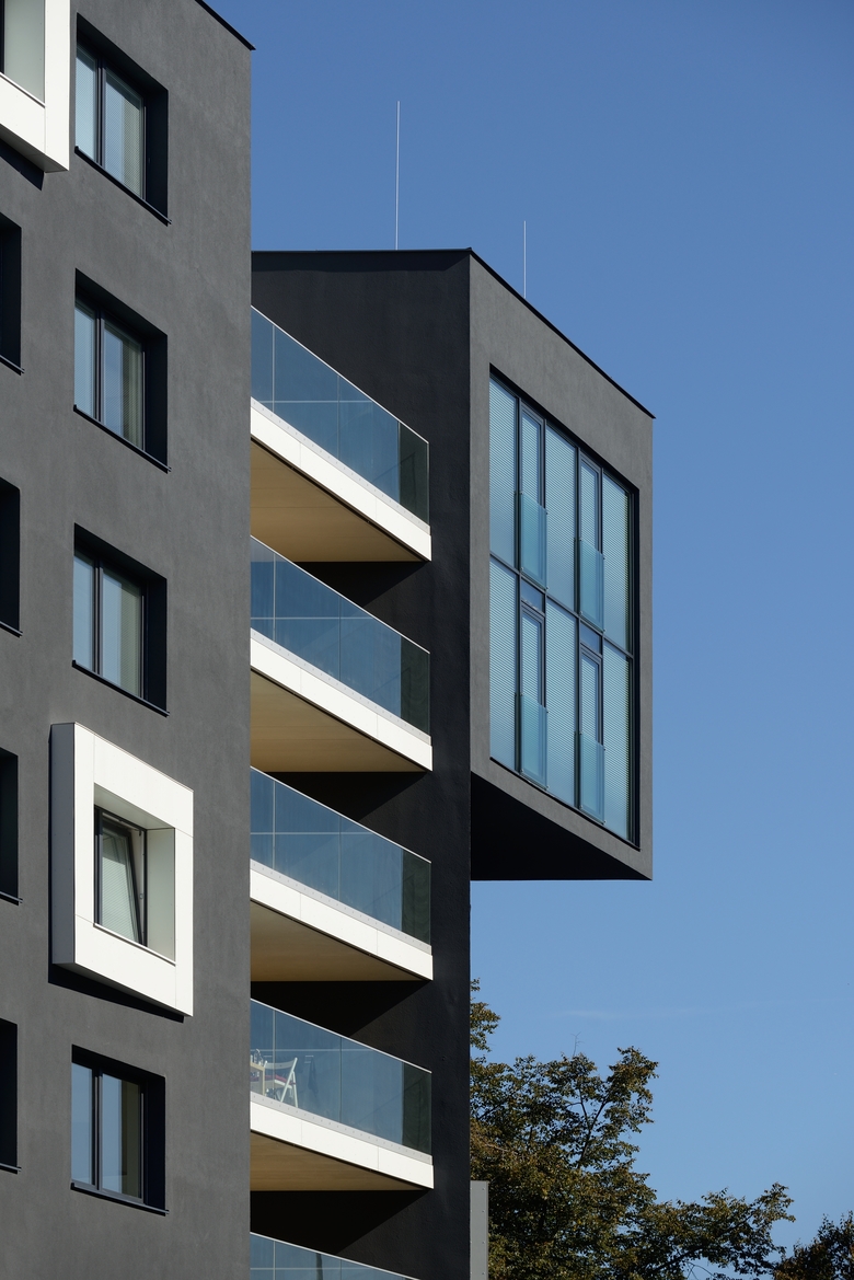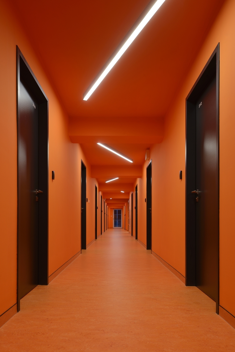 The basic concept of the building consists of two main parts. The façade including the rooms behind create the ‘skin’ of the building, a neutral black-and-white exterior envelope, while the corridors and stairways are the building’s ‘arteries’. Invigorated with rich colours they become a vivid communication hub. The corner position of the building is highlighted on the top by a new double-floor oriel featuring study rooms – the knowledge centre of the building.