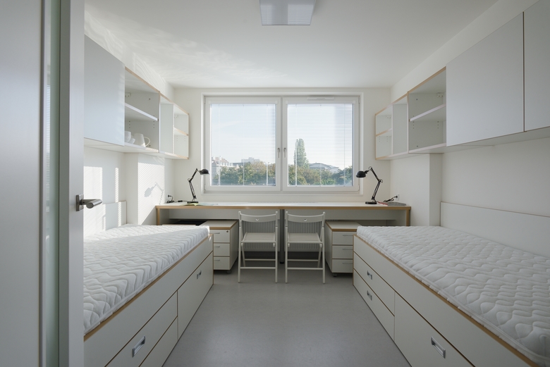 Self-contained double rooms, i.e. each with a bathroom and a toilet, are placed in the existing reinforced-concrete pole span. Single and four-bed rooms, including rooms for students with physical impairments, are designed for end and corner positions. Each floor is equipped with a common kitchenette for cooking meals. A reception and a restaurant are available from the entrance lobby. The basement features a student’s club, fitness, laundrette and building services.