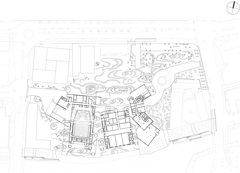 Inside, three volumes hold a large symphony hall, a flexible hall and a conference hall, which are clearly defined elements that, through their mutual composition, set the tone for the musicality of the building. The three building masses have an almost-urban scale that supports the idea of 'a city within the city'. The interior is simple, consisting of rough black concrete, stone, wood and brass. The street life outside is drawn directly inside to support the open nature of the building.