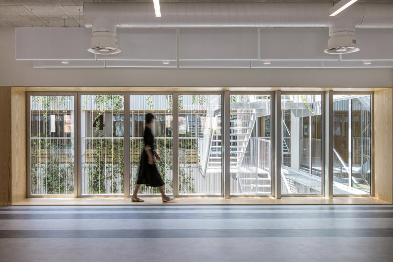 The design introduces a stepped green courtyard, enhancing daylight and natural ventilation throughout the interior spaces. The terraced section optimises light penetration on every floor and creates outdoor terraces that extend the work areas with new spaces for meetings and informal gatherings. A new staircase within the courtyard strengthens vertical connectivity between floors and encourages healthy habits, with vegetation taking a central role in the experience. The ground floor is conceived as an extension of the public realm, articulated through a multifunctional lobby integrating reception, bicycle parking, foyer, and auditorium, with the green courtyard serving as the central feature and backdrop.