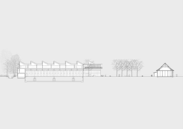 Erschliessung / Zwei Gebäudeteile gliedern das Volumen in einen Sockelbereich und ein darüber liegendes schwebendes Obergeschoss. Dazwischen entsteht eine grosszügig, gedeckte Pausenhalle, welche den zentralen Pausenplatz im Süden mit dem Allwetterplatz im Norden verbindet. Hier befinden sich der Haupteingang der Schule und ein separater Eingang für die Sporthalle. Eine Grosszügige zweigeschossige Eingangshalle empfängt die Besucher und schafft durch die Ausrichtung zum Platz einen Bezug zum Mehrzweckraum in der umgebauten Remise. Von diesem zentralen Raum führt eine überbreite Wendeltreppe zu den verschiedenen Nutzungen und verbindet alle Geschosse miteinander.