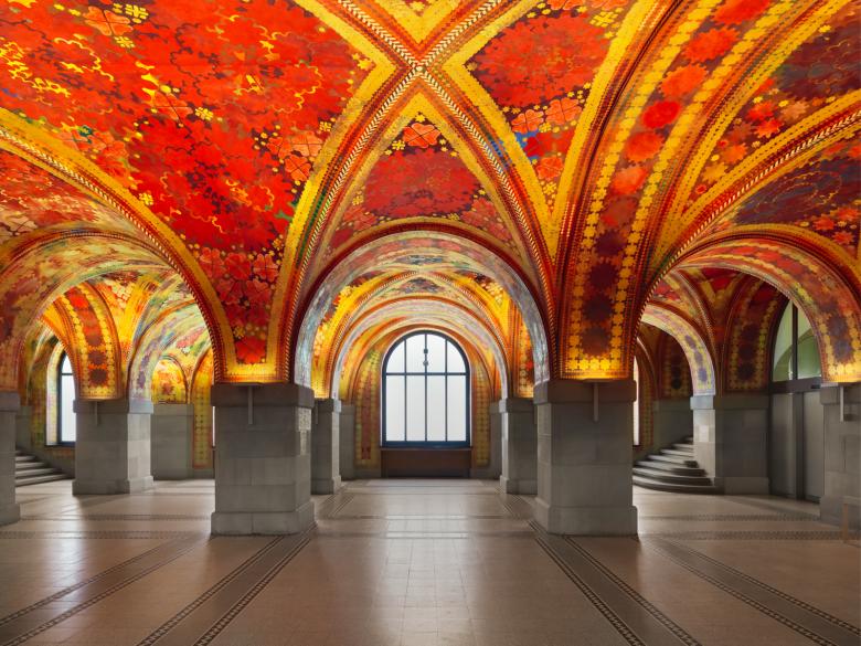 Mit dem Fresko von Augusto Giacometti beherbergt das Amtshaus I eines der bedeutendsten Kunstwerke der Stadt. Im Zuge der Gesamtsanierung wurden wir mit der Konzeption und Planung einer neuen Beleuchtung beauftragt. Wir ersetzten die alten, auffälligen Leuchten mit einer diskreten Beleuchtungslösung. Die Lichtabgabe setzt nun präzise über den Sandsteinsäulen ein und steigert sich sanft bis zum Zenit der Kuppeln. Durch Ermittlung der optimalen Farbtemperatur am Werk und der hervorragenden Farbwiedergabequalität der eingesetzten LEDs, wird die einst als tiefrot empfundene Malerei zu einer ungeahnt frischen, farbigen Welt. Sonderkonstruktionen, wie Abschrankungen mit integrierten Leuchten, welche die vier Wandbilder ausleuchten und hinterleuchtete Fenster ergänzen unsere Interventionen.