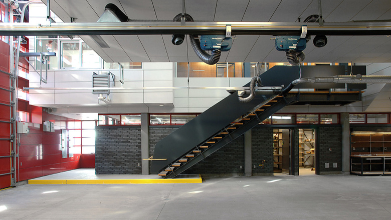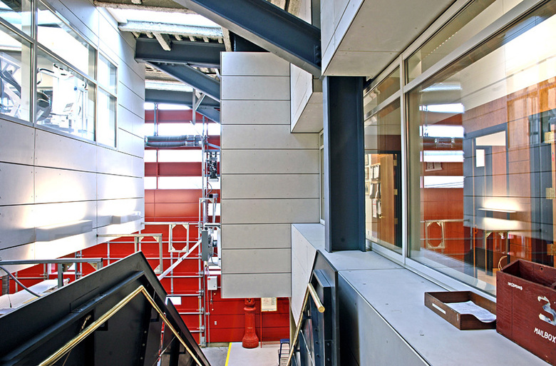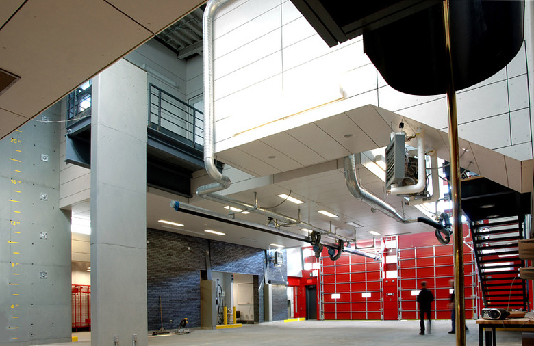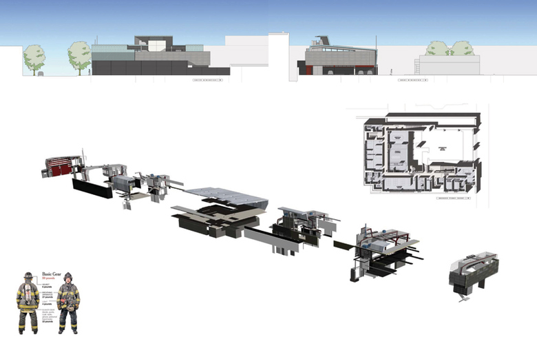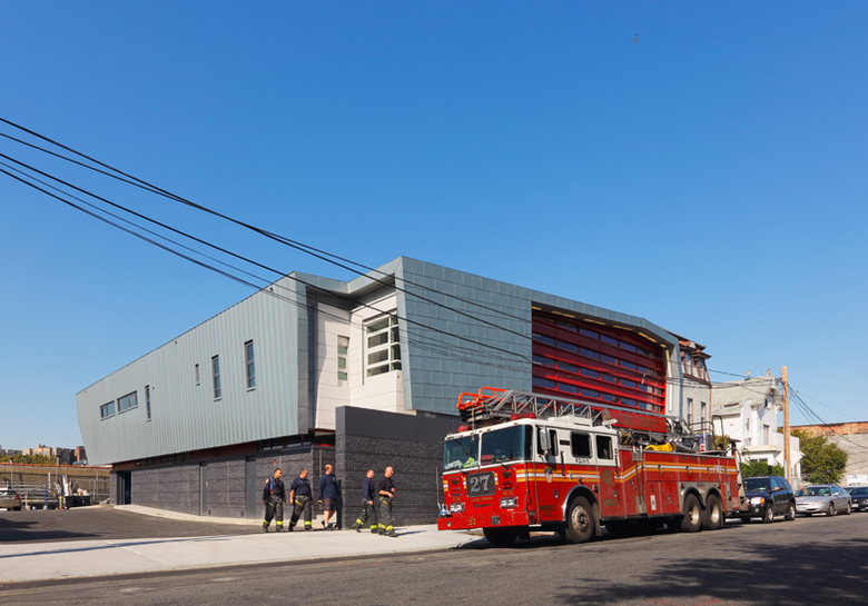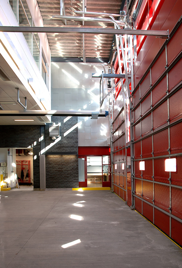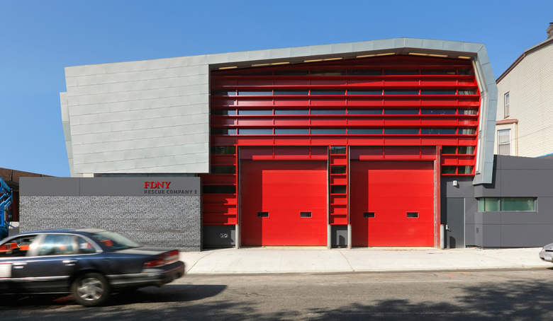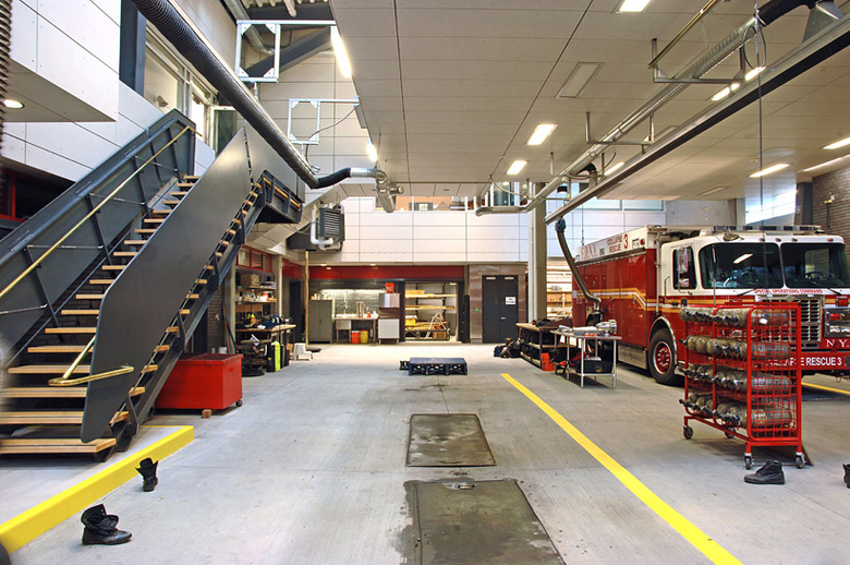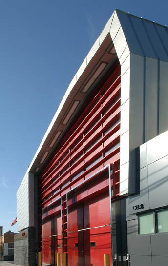 This high performance, durable, well-organized, maintainable “machine” is one of five special operations rescue facilities in New York City. In addition to firefighting, these elite companies respond to more specialized emergency situations such as building collapses, subway emergencies and scuba operations and thus have special infrastructure and equipment storage requirements. All spaces in the building are strategically located in relations to the centrally placed Apparatus Rig, the most important element in the house. Responding to the restricted site, functions are stacked: physical work areas and storage occupy the ground and basement levels; rest, study and dining are at the second level; and training and fitness spaces are at the mezzanine level. The primary design elements of the building’s east façade are oversized FDNY-red apparatus doors, which express the building’s identity as a FDNY facility and create an open, yet secure street presence.