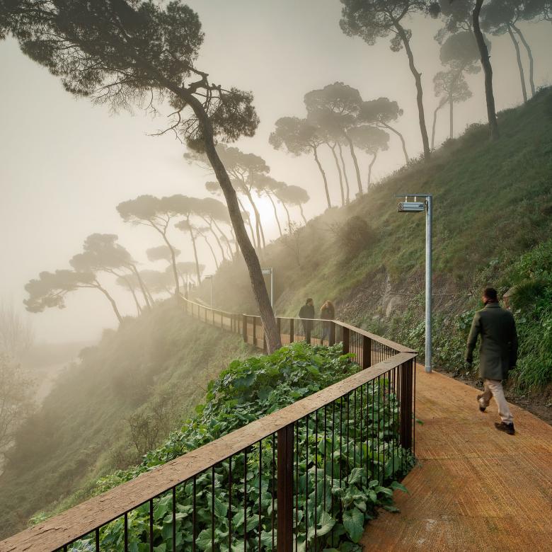 The project is located in an interstitial space between municipalities, at the confluence of the Collserola and Marina mountain ranges, and adjacent to the Rec Comtal and the Besòs River. Its aim is to improve pedestrian access between the Vallbona and Can Sant Joan neighbourhoods by subtly regularising the existing path’s alignment and gradient, addressing the lack of connection through a focus on soft mobility and a healthy, biophilic, and accessible city.