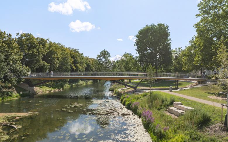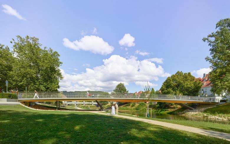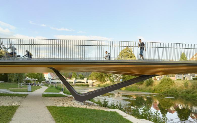 Die neue Rathausbrücke nimmt in ihrer Gestalt als Deckbrücke den Verlauf der Rathausgasse auf und verlängert diese bis an das andere Flussufer. Dort knüpft sie an den Donauradweg an und verbindet diesen mit der Tuttlinger Innenstadt. Mit der geforderten Breite von sechs Metern wird eine großzügige und begreifbare Verbindung geschaffen. Es wurde auf eine aufstrebende Konstruktion verzichtet. So bleibt der Blick frei auf die umgebenden stadträumlichen Bezüge und die wunderschöne Fluss- und Uferlandschaft, die Tuttlingens Innenstadt durchzieht und ihren unverwechselbaren Charakter ausmacht. Die Aufenthaltsqualität im Bereich des Donauparkes unter der Brücke wird durch eine feinfühlig gestaltete Untersicht aufgewertet. Darüber hinaus beschränkt sich der Entwurf zurückhaltend auf funktionale Qualitäten, eine innovative semiintegrale Tragwerkslösung, materialgerechte Detailgestaltung und robuste wartungsarme konstruktive Durchbildung.