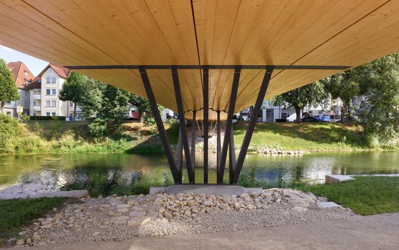 Im witterungsgeschützten Raum oberhalb des Hochwasserstands HQextrem entfaltet sich der Träger als blockverleimter Brettschichtholzkörper. Zur konzentrierten Ableitung hoher Kräfte mit sehr schlanken Bauteilen werden die Unterbauten aus Stahl ausgeführt. Auch im Hochwasserfall steht damit eine robuste Lösung zur Verfügung.
