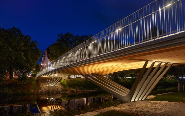 Holz, Stahl und Beton. Im Dreiklang dieser Materialien entfaltet sich der skulpturale Brückenkorpus. Jedes Material wird materialgerecht eingesetzt. Beton bildet die Deckfläche im Verbund mit dem darunterliegenden Holzkörper. Der Beton wirkt als robuster Gehbelagsunterbau und schützt das Holz zuverlässig und dauerhaft vor Witterungseinflüssen. Ein Dünnschichtbelag als Versiegelung schützt den Beton und fungiert als Wartungsschicht.