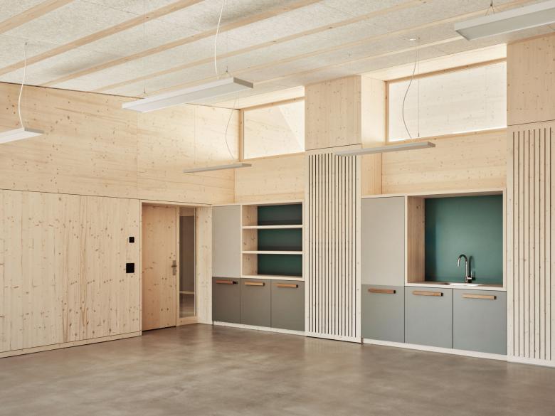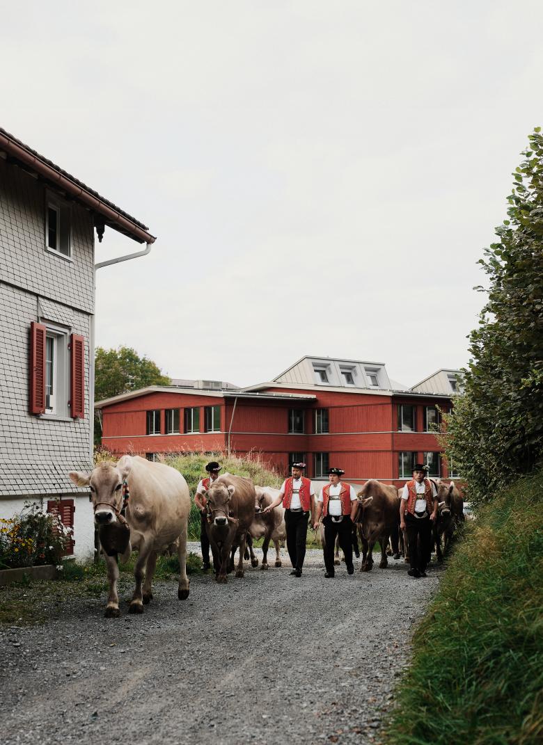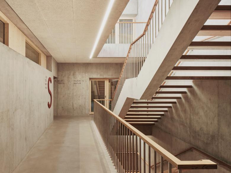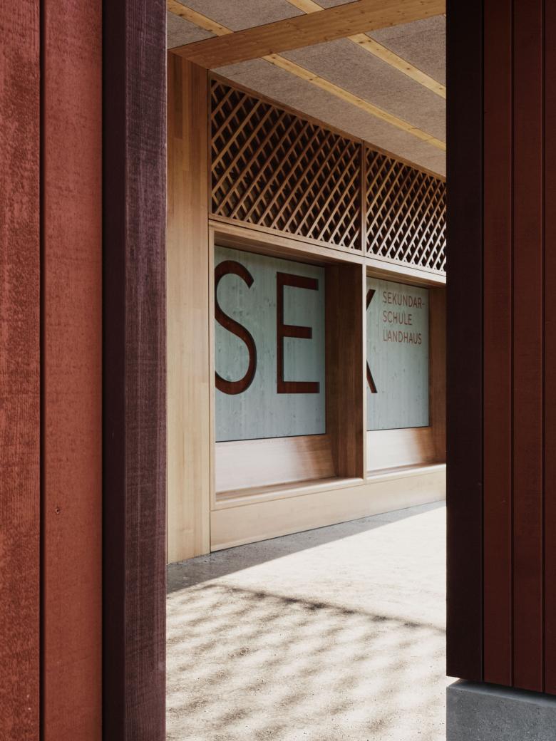 Das neue Sekundarschulhaus fügt sich als längliches Volumen in die gewachsene Topografie des Lindenhügels ein. Das Schulhaus steht traufständig zur Landhausstrasse. Zum Dorf hin zeigt sich der Neubau dank einer Rückstaffelung in der Stirnfassade ortstypisch mit einer schlanken Giebelfassade mit einem eingeschossigen seitlichen Anbau. Dank dem Schrägdach entspricht die Silhouette dem dorfbaulichen Charakter und die Fassade zeichnet sich durch eine handwerkliche Detaillierung aus. Auf dem massiven Gebäudesockel liegt ein einfach strukturierter Holzbau auf. Die Fassaden