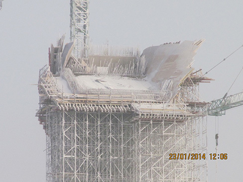 Die Flanken des V – förmigen nach oben hin breiter werdenden Turms, verziehen sich in einer Torsionsbewegung in die Höhe.