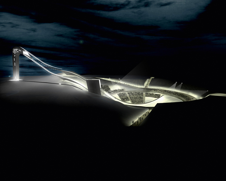 Die harmonischen Linien der Schanze fließen als Landschaft in die Anlage der Arena, welche durch die ganz bewusst platzierten Bauteile der Tribünen und Stufen gestaltet und strukturiert wird.