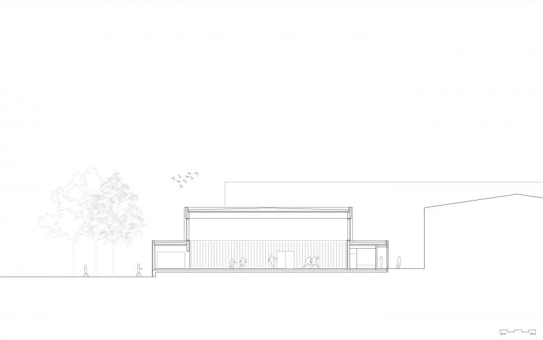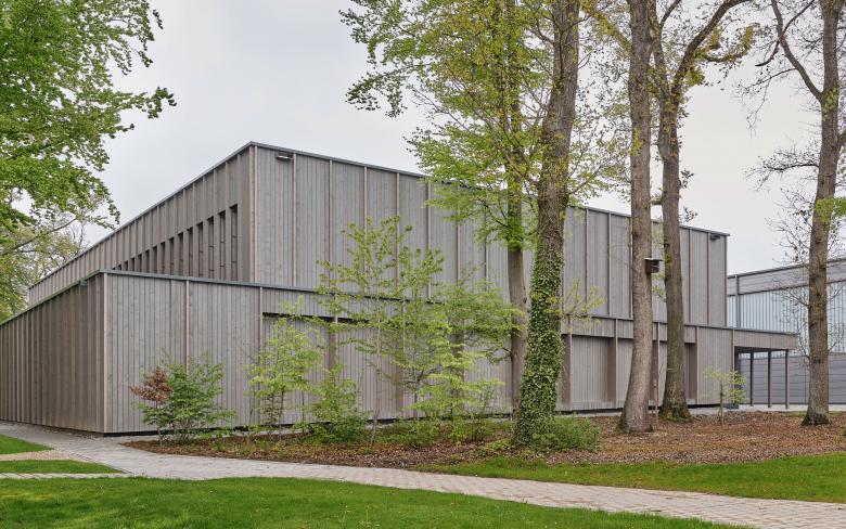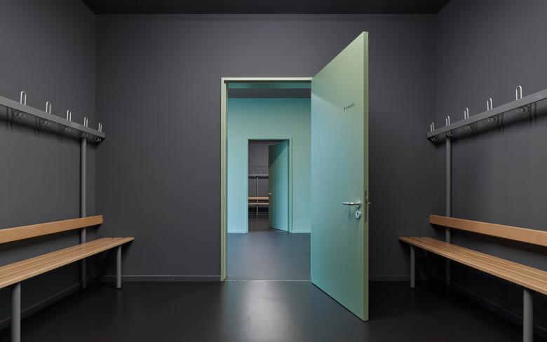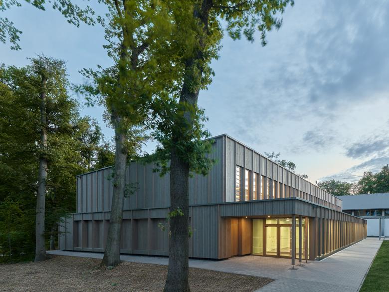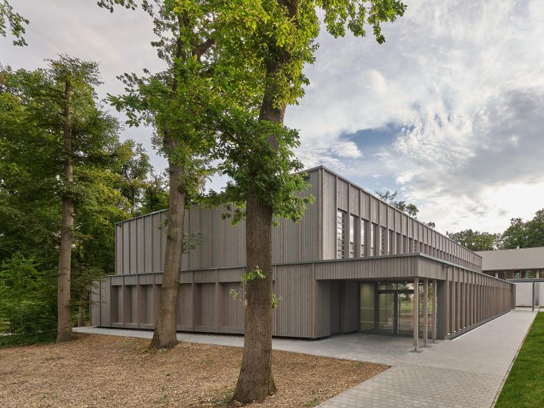 Das Gebäude bezieht seine Gestalt aus dem Kontext sowie der konsequenten Umsetzung als Holzbau. Die gewählte geometrische Ordnung ist durch die vertikal gegliederte Lisenenfassade außen ablesbar. Struktur, Material und Farbe fügen sich selbstverständlich in den Kontext des Wäldchens ein. Auf der waldzugewandten Seite finden die Sportler/ innen Sitznischen in der Fassade, ein Rückzugsort zum Durchatmen und Regenerieren, für Besprechungen im Schatten der Bestandsbäume.