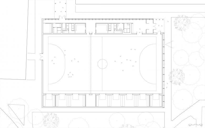 Der eingeschossige Baukörper ist in drei Funktionsbereiche gegliedert, die sich auch in der Gebäudekubatur nach außen zeigen. Die mittig aufsteigende Halle wird auf der einen Seite vom niedrigeren Foyer mit Umkleidespange und auf der anderen Seite von den angrenzenden Geräteräumen gefasst. Das Foyer mit direktem Zugang zur Halle führt das Grün des Außenraums nach Innen fort. Über den durchgängig verglasten Straßenschuhgang werden die Umkleiden sowie die Halle erschlossen. Im hinteren Bereich des Flurs sichert eine neue Überdachung die witterungsgeschützte Anbindung an weitere angrenzende Campusgebäude.