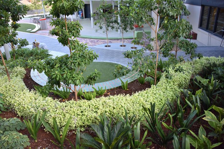 The existing courtyard contained tired garden beds, retaining walls and large spans of red brick paving. The design eliminated all the straight lines of this structured area. RWA created an inspiring, innovative and invitational space with lots of “wow” elements to engage everyone that moved through these area.