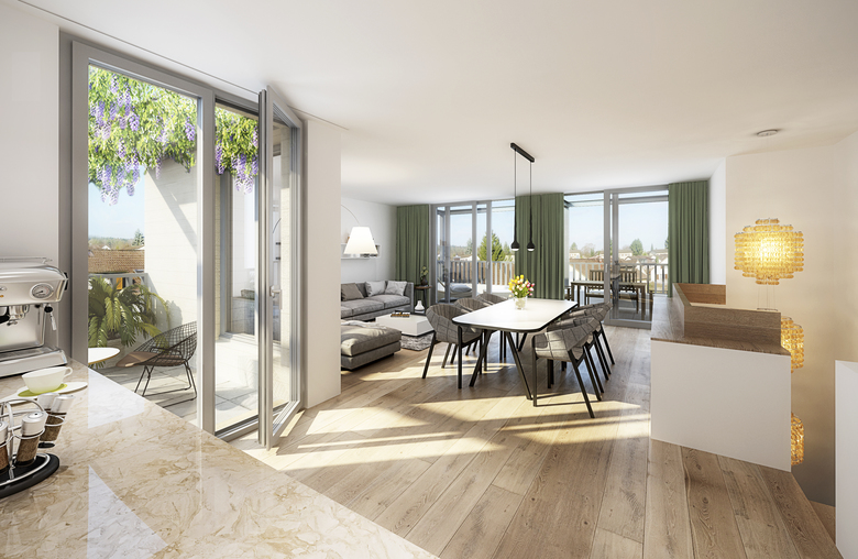 Jede Familie hat ihren eigenen Hauseingang, der von draussen direkt in die privaten Räume führt und das Gefühl des Eigenheims unterstreicht. Jede Partei besitzt zudem mindestens einen exklusiven Aussenraum, private Kellerräume mit eigener Waschküche und unabhängiger Haustechnik sowie einen Parkplatz direkt vor der Haustüre. Die vier Maisonette-Wohnungen sind mit je 4 1/2 Zimmern zwischen 125 m2 und 135 m2 gross, mit jeweils einem grosszügigen Wohn-Ess-Koch- und einem Schlaf-Geschoss mit drei hellen Zimmern und zwei Bädern mit Tageslicht. Die interne Treppe verbindet alle Geschosse. In den Attika-Wohnungen ergänzt ein interner Lift die Erschliessung. Die Attika-Wohnungen besitzen je zwei Dachterrassen, zu den Gartenwohnungen gehört jeweils ein grosszügiger Garten.