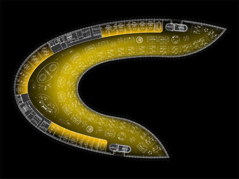 Das Tiefgeschoss nimmt 170 Stellplätze auf. Unter dem aufgeständerten 1. Obergeschoss befinden sich im Erdgeschoss neben der Lobby ein Restaurant und Räume für Konferenzen und Workshops. In den Obergeschossen sind die Bürobereiche mit 70% open space-Flächen für größtmögliche Flexibilität angeordnet.