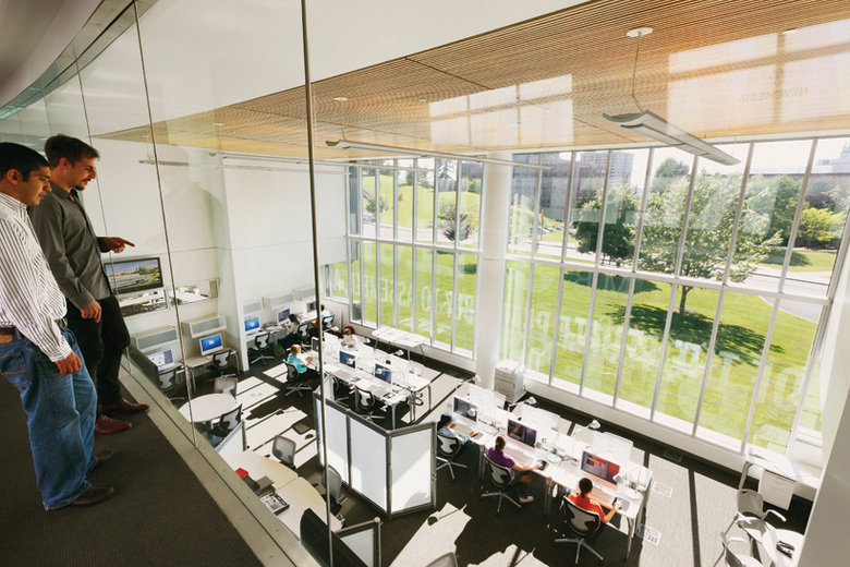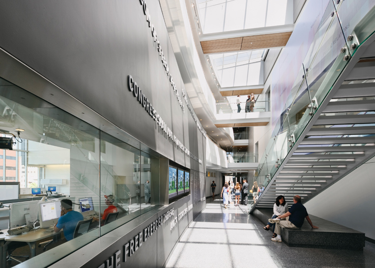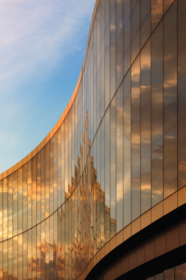 Sited between the historic campus center to the south and the town of Syracuse to the north, Newhouse III joins two pre-existing buildings to complete the campus-within-a-campus and define a new identity for the Newhouse School. The new building rationalizes the existing complex's labyrinthine circulation system and acts as a conduit to connect Newhouse I and II on all floors. A simple bar, which houses classrooms, conference rooms and the mechanical and circulation core, is separated from the ribbon-like glass form by a three-story, skylit atrium. A space for informal and serendipitous encounters among faculty, students and staff, this new interstitial zone functions as the social and communal heart of the School. Light-filled, with a glass skin that changes dramatically in response to atmospheric conditions, the sinuous, undulating form boldly marks the gateway to the campus.