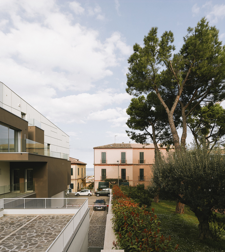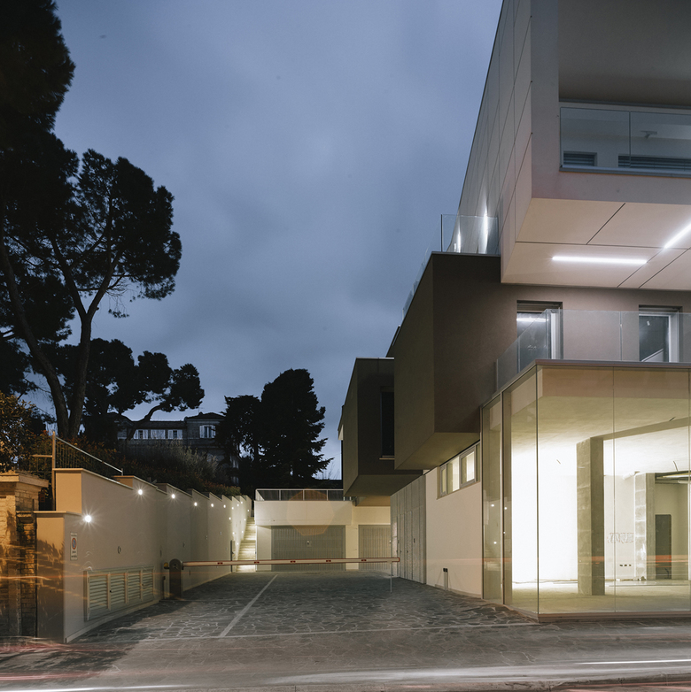 L’idea di progetto parte dalla conformazione del terreno in declivio. Su di un basamento costruito (parte commerciale, servizi alla residenza, giardini pensili) è posto un volume che guarda verso est (mare); la sua semplice geometria si piega e deforma sul fianco sud andando a catturare il paesaggio del parco adiacente.