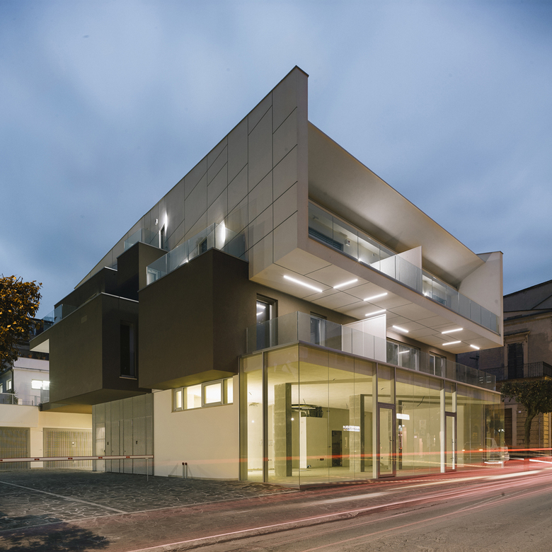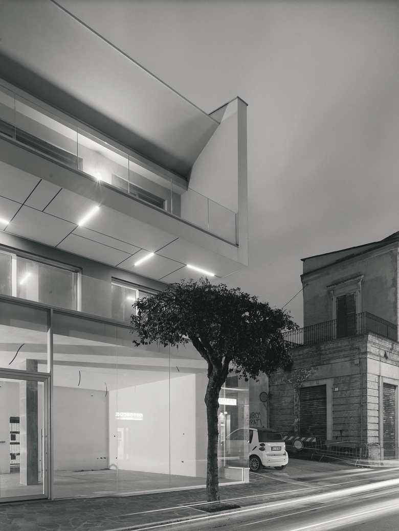 1) parte basamentale (a destinazione commerciale e locali accessori) che ha affaccio diretto su via Antonio Gramsci e realizzata in vetro trasparente