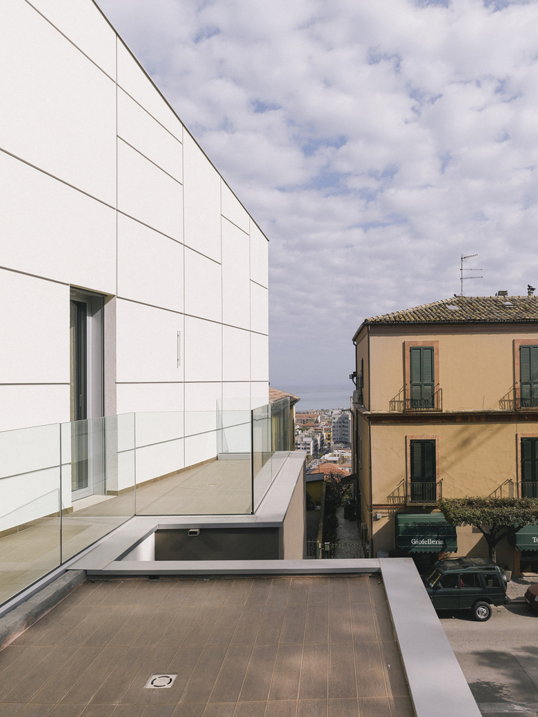 Questa parte è scolpita dalla tessitura del rivestimento in pietra. I prospetti est ed ovest sono pensati con aperture molto grandi per poter facilmente godere degli affacci verso il mare e verso le montagne. L’intervento si compone di una superficie complessiva di circa 1600,00 mq.