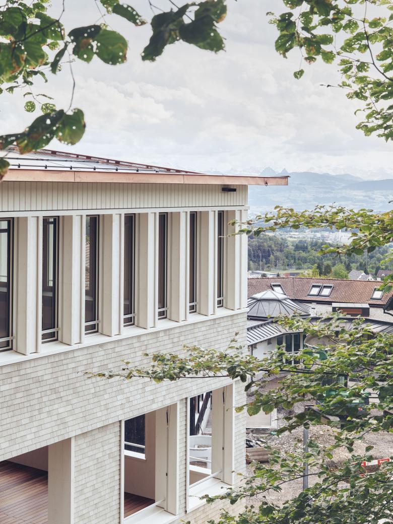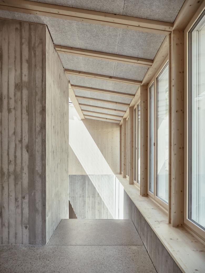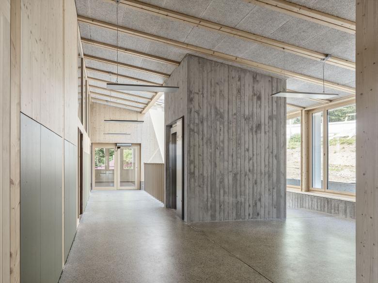 Der Ergänzungsbau des Schulheim St. Michael fügt sich als längliches Volumen in die Landschaft und das bestehende Gebäudeensemble ein. Der Neubau übernimmt die Prinzipien des Hauptgebäudes und schmiegt sich selbstverständlich an den leicht gegen Westen gedrehten Hang. Die architektonische Gliederung in der Form eines Andeutens eines Dach- oder Mansardengeschosses vermittelt zum südlichen Schulhaus. Der Projektvorschlag bietet eine einfache Grundstruktur als soliden Rohling für die tägliche Schulnutzung.
