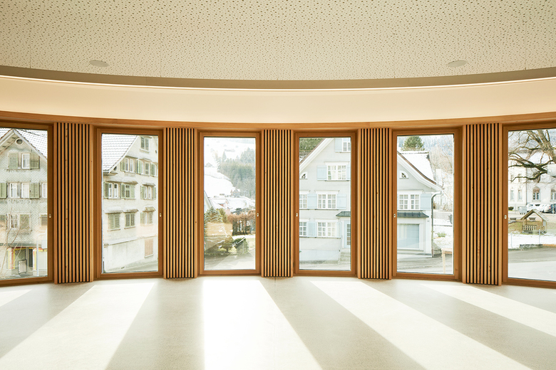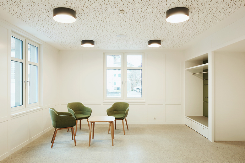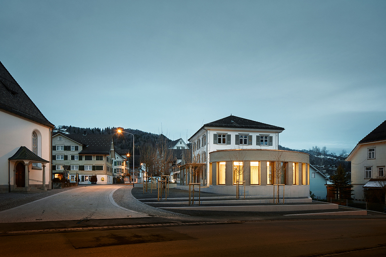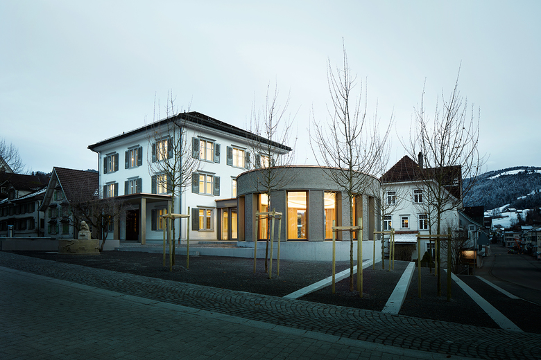 Der Projektvorschlag gründet auf der Idee eines einladenden Kirchgemeindezentrums mit offenen Türen für alle. Die Kirchgemeinde verbindet als Gastgeberin die Dorfteile, Aussengegenden, Generationen, Kulturen, Konfessionen, Religionen und Lebenswelten. Das Raumkonzept lässt die Bespielung verschiedenster Zielgruppen zu. Der neue Pavillon symbolisiert dieses Forum mit der eigenständigen Form. Der Mehrzweckraum wird als einziger Hauptraum aus dem bestehenden Pfarrhaus ausgelagert. Ein kleiner Verbindungstrakt führt vom Saal in das Pfarrhaus mit dem grosszügigen Foyer. Die Küche gliedert sich erdgeschossig direkt an das Foyer und kann den Saal sowie das Foyer optimal bedienen. Der Pavillon kann als einladender, flexibler Raum genutzt und bespielt werden.