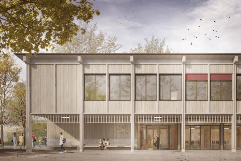 Der neue Saalbau stärkt die Identität der Schulanlage und definiert eine starke Adresse im Dorfkern von Grüsch. Das alte Schulhaus und Rathaus bleiben die Protagonisten des Schulensembles. Der Neubau ordnet sich trotz seiner Grösse, aufgrund der Materialisierung aus Holz und der geduckten Gebäudehöhe den verputzten Patrizierhäusern unter. Gegen Süden bietet der Neubau einen über die gesamte Gebäudelänge durchgehenden Portikus. Die gedeckten Freiraumflächen sind für den Schulalltag und die abendlichen Saalnutzungen wertvoll. Die Bühne wird zum neuen Schulhof hin orientiert. Es resultiert eine Dreifachnutzung des Bühnenraumes: im Schulalltag wird die Bühne als vollwertiger und gut belichteter Innenraum genutzt, bei Veranstaltungen kann sie sowohl zur Turnhalle hin als auch in Richtung Schulhof als gedeckte Aussenbühne genutzt werden. Durch diese Anordnung ist die Nutzung sehr flexibel und der neue Saalbau ist äusserst vielseitig bespielbar. Der Projektvorschlag „Fundus“ bietet dank der Anordnung und unter Verwendung einfachster Mittel wertvolle Vielfalt.
