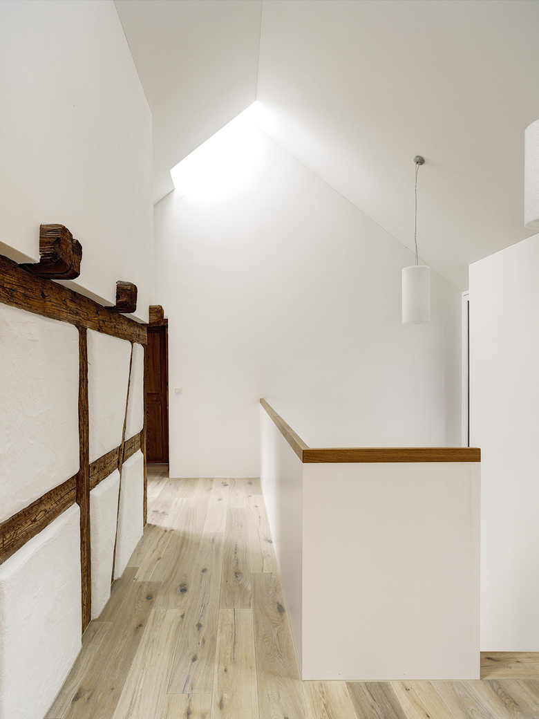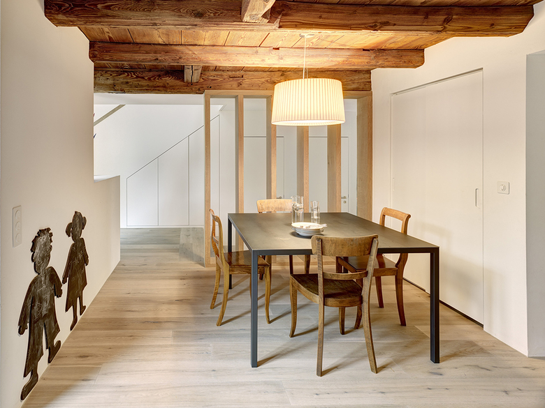 Das historische Riegelhaus steht unmittelbar an der Vorstadtstrasse neben dem Dorfbach in Küttigen. Zurückversetzt von der Straße steht ein zweigeschossiger "Turmspicher" in verputzter Massivbauweise. Der neue Anbau verbindet die beiden Baukörper als eine leichte Holzkonstruktion und vereint die Teile wieder zu einer stimmigen Gesamtkomposition. Die sichtbaren Gebäudestrukturen des Bestandes bleiben wo immer möglich erhalten. Die Wohnräume im ehemaligen, überhohen Heutenn sind neu ringförmig um den mittig gesetzten Kachelofen angeordnet.