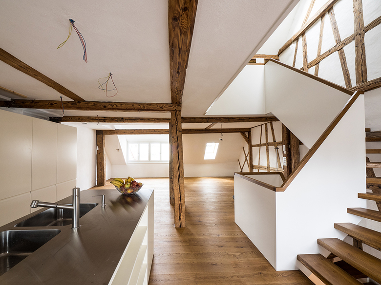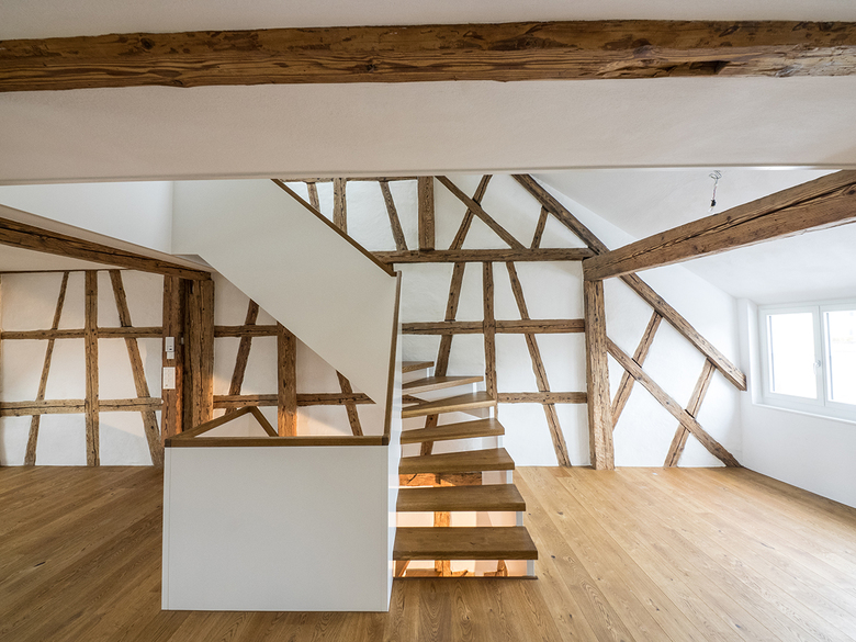 Das dreigeschossige Wohn- und Gewerbehaus steht in der geschlossenen östlichen Häuserzeile der Schmiedgasse. Die Häuserzeile lehnt sich ostseits / rückseits gegen die einstige Stadtmauer mit Stadtgraben und Schanz. Das architektonische Konzept gliedert den Raum mit einem Infrastrukur und einem Erschliessungskern. Durch eine sich gegen oben öffnende Wendeltreppe, erhalten die Wohngeschosse eine grosszügige Vertikalverbindung. Die historischen Zimmermannsarbeiten wurden sorgfältig restauriert und in Szene gesetzt.