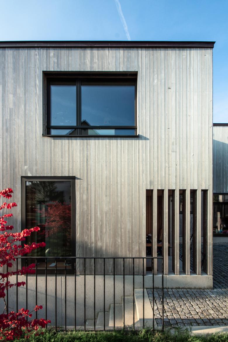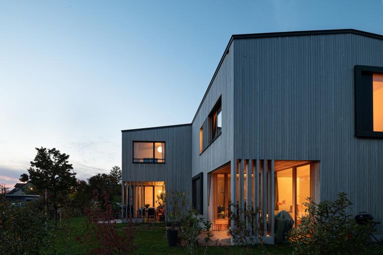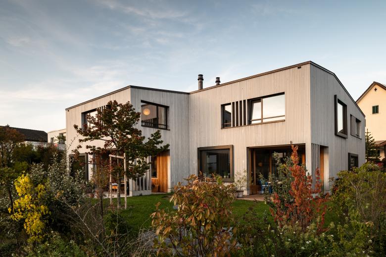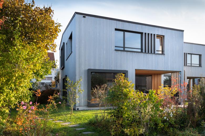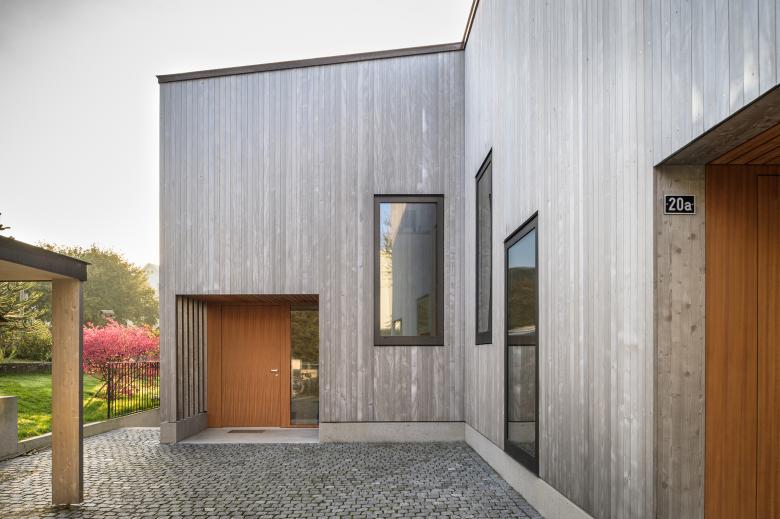 Das Doppelfamilienhaus in Holzbauweise befindet sich in einem ruhigen Wohnquartier. Dank der verzahnten Gebäudeform und dem leicht geneigten Dach gliedert sich der Baukörper in das bestehende Quartier ein und beide Hausteile werden ideal belichtet. Die Hauszugänge befinden sich im Norden an der Rückseite des Gebäudes: Über einen gemeinsam genutzten Eingangshof werden die beiden Hausteile erschlossen. Gegen Süden wird ein grosszügiger Garten