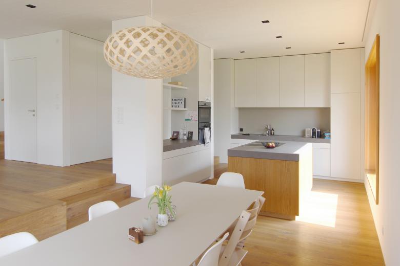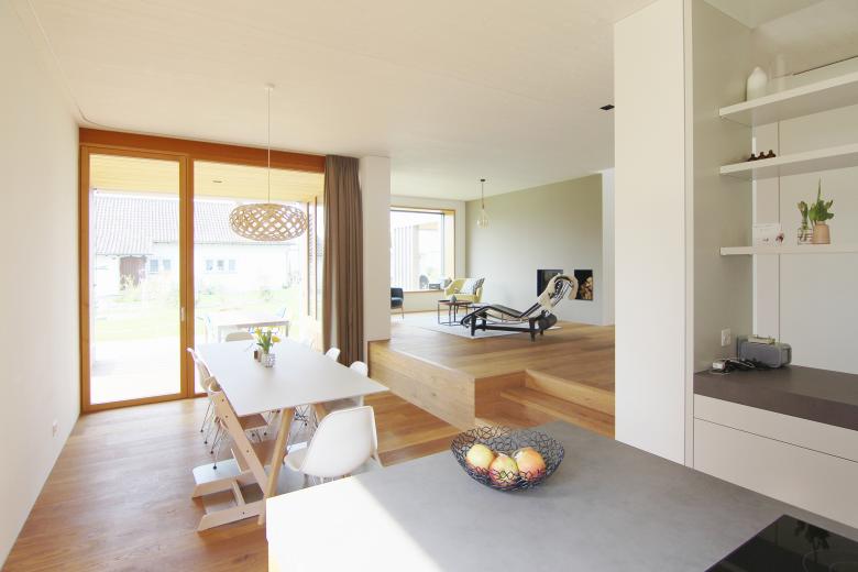 erstellt. Im Innern sind die beiden Hausteile sinnverwandt gestaltet. Das Erdgeschoss besticht durch einen fliessenden Grundriss mit Wohn- und Esszimmer und der angegliederten offenen Küche. Der Essraum verfügt zudem über einen direkten Zugang zur Loggia, welche in den Garten führt. Im Obergeschoss sind jeweils drei Zimmer, sowie ein Multifunktionsraum angeordnet, welche somit viel Platz und Möglichkeiten für die beiden Familien bieten.