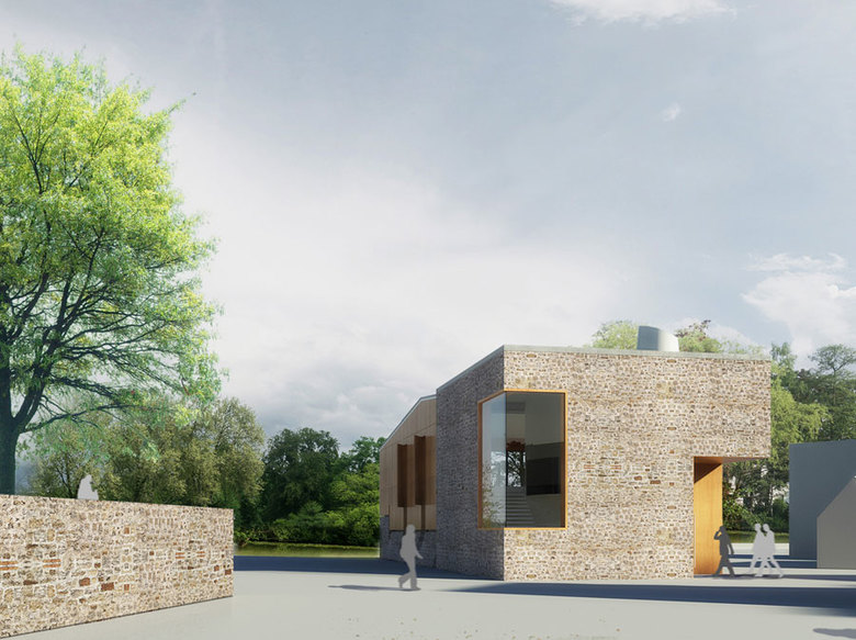 Strategie Wir fügen die einzelnen Bausteine die Funktion, Material, die Kosten, durch „einfache“ Überlegungen zusammen. Der Bruchsteinkubus nimmt in seiner Stellung und Proportion exakt die Aussenmaße des ehemaligen Pfarrhauses auf. Das zentrale Motiv „Kirche auf dem Tisch“ am Tor zwischen Stadt und Niddaaue wird im offenen Treppenraum erlebbar. Der weitergeführte Sockel ist die Basis für den Saal in Holzbauweise. Die Zuordnung der Funktionen, die Konstruktion und das Material werden vom Energiekonzept bestimmt.
