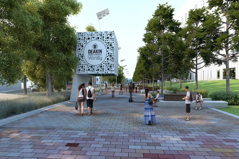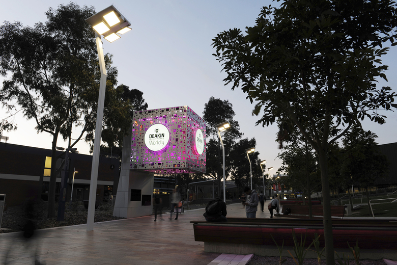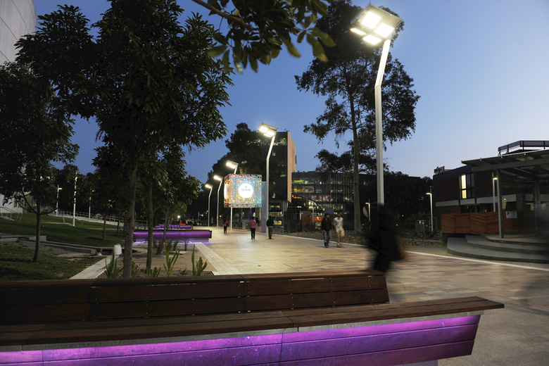 This design has rebuilt the centre of the Deakin University campus at Burwood. The existing campus spine was narrowed down and paved in 6 tonnes of granite. An asymmetric cross section for the space develops a two sided programme: a double row of new shade trees with custom seating, and a dramatic row of 12.0 metre light columns carrying LED flat panels.
