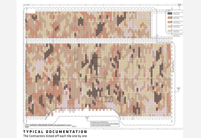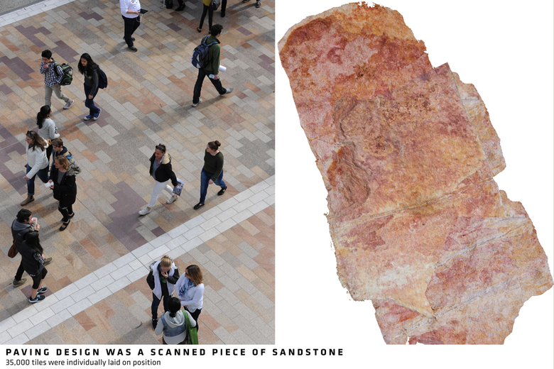The project delivers a 160m long, multi-coloured granite paved spine with fully compliant access to 13 different buildings set on as many different floor levels.
