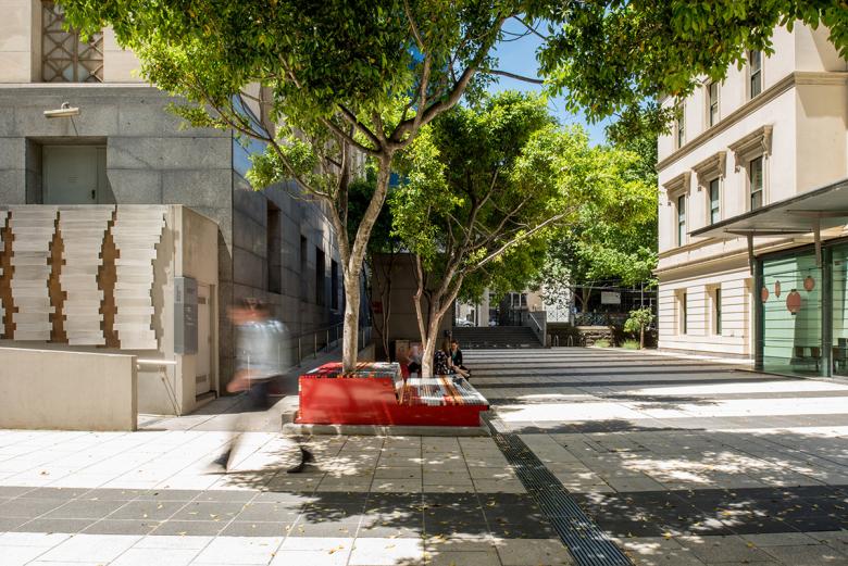 The limited budget forced us to be extremely resourceful in our site planning and built scope. In a garden bed which frames the rear of a courtyard, we thinned out the existing Ficus, retaining only trees with a successful canopy, then designed a ‘seat’ or platform around them. The seat – or urban ‘beam’ was designed to provide a variety of seating orientations. The remainder of the bed was covered in a vibrant red turf carpet garden to create a small outdoor classroom.
