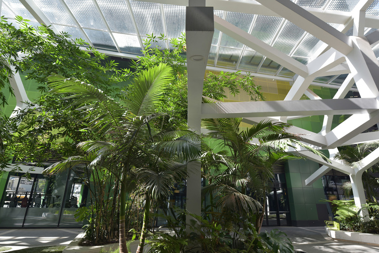 Self-clinging climbers are already climbing the columns, while experimental trees like Ceiba speciosa already reach for the roof. These are test plantings; part of the lab. This is not without risk, but the dependables will grow well.