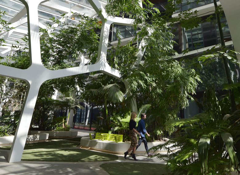 It feels lush and green here, a warm city garden, a place where one might choose to be; a big urban lounge even, and a type of back yard. A little dark at times perhaps, but beautifully lit in the evening. It is both interior and exterior, just breezy enough, and nicely protected overhead.