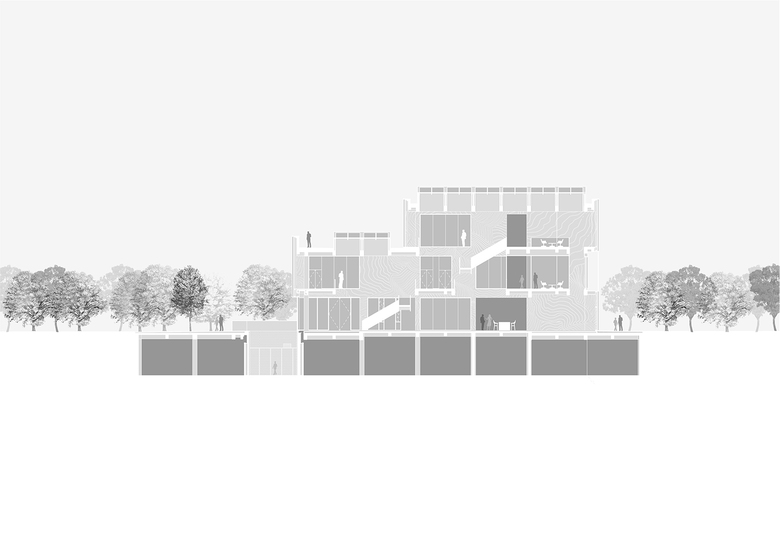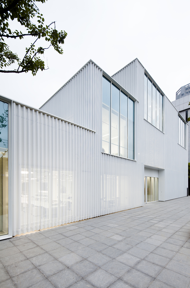 Commissioned by CaoHeJing in 2014, Schmidt Hammer Lassen architects' proposal was to overclad and unify the existing rendered concrete facade utilising a corrugated and perforated polyester powder coated aluminium skin.