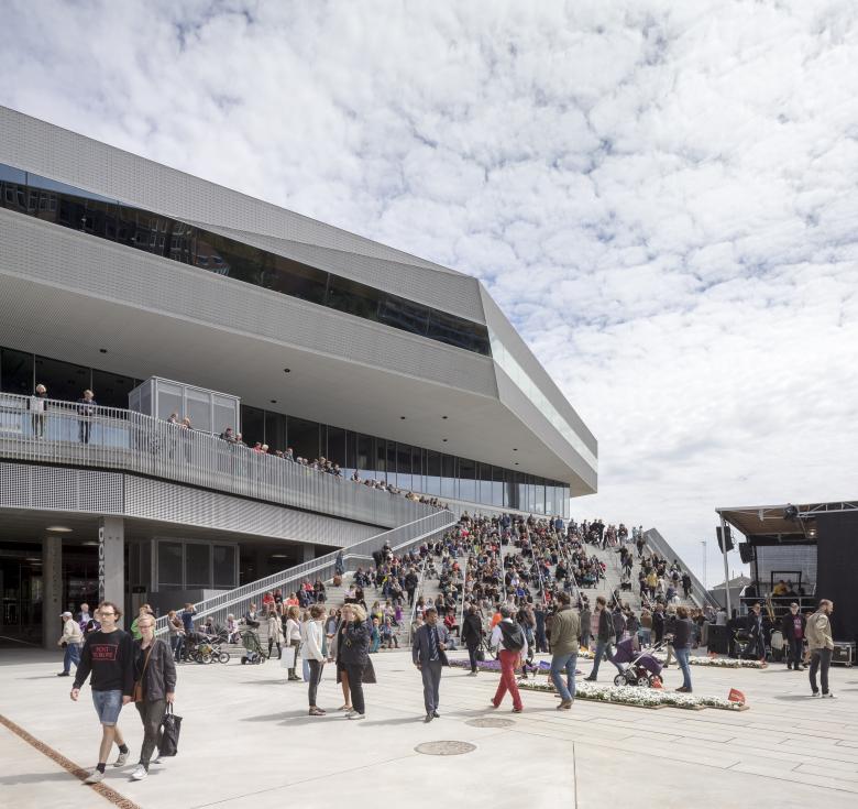 Dokk1 opened its doors to the public on Saturday, 20 June, becoming the largest public library in the Nordic countries, representing a new generation of modern, hybrid libraries. The 30,000 square metre building is part of the Urban Mediaspace project, which is transforming the harbour front of Aarhus. The project houses the new library, a citizen service centre, automatic parking for 1,000 cars and new harbour-side public squares. With a budget of over € 280 million, it is the largest construction project by the Municipality of Aarhus in the city’s history.