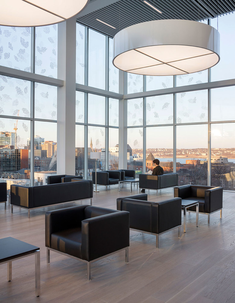 The construction of the library is essentially cubic in form with four significant 'volumes' vertically placed on top of one another with a horizontally twisted and shifted facade alignment. A number of distinctive cantilevers and one signature larger cantilevered element create a voluminous expression whereas the remaining façades align elegantly with the neighbouring façade of the classic architecture of Dalhousie University’s Architecture School. From the top of the building - the Halifax Living Room - there is access to an open green roof terrace providing a unique view towards Halifax Harbour, Citadel Hill, the historic George’s Island, Dartmouth and onto McNabs Islands that reaches out towards the North Atlantic Ocean.