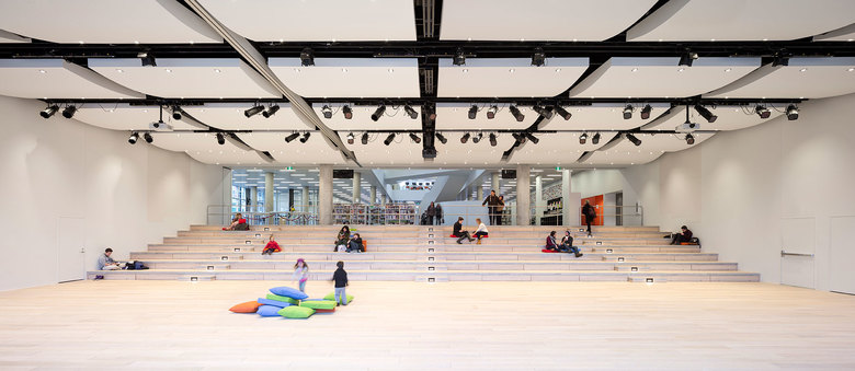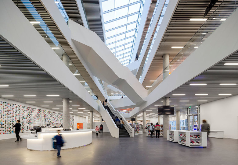 The new library is a multifunctional cultural hub with direct accessibility to the vibrant surrounding urban context of historic and new buildings, and the buzz of downtown. The library building stands as a reflection of the diversity of the community and the modern life within the municipality as a whole, and as a flagship for all 14 branch libraries servicing the whole municipality.