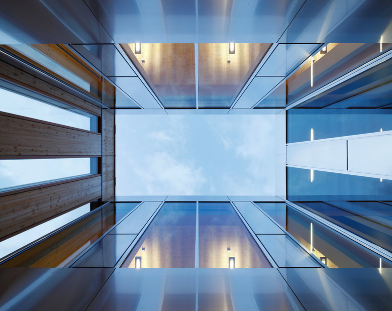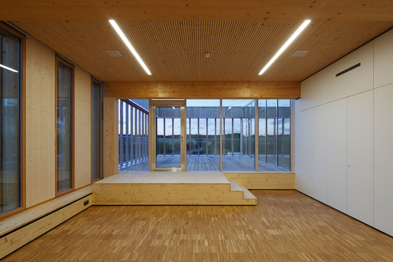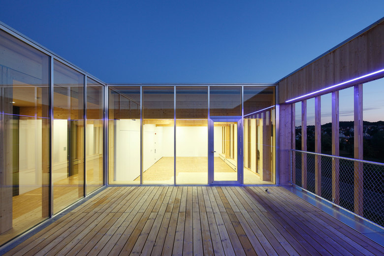 Das Gebäude mit seiner einheitlich, vertikal rhythmisierten Fassade aus Lärchenholz erhält seine unverwechselbare Eigenständigkeit durch einen Landschaftssteg, der in einen tiefen Gebäudeeinschnitt übergeht und am Haupteingang einen fließenden Übergang von Außen- und Innenraum herstellt, eine Dachterrasse, die den freien Blicke in die Landschaft ermöglicht und ein großes, in ein Labor Einblick gewährendes Schaufenster.