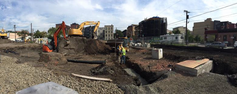 In a flood-prone corner of Hoboken, Starr Whitehouse led an interdisciplinary team of engineers, designers, and cost estimators to craft a resilient core of stormwater detention systems tucked into a community-designed urban park. Developed with residents in an intensive series of design workshops, the park’s interlocking social spaces enliven this former industrial neighborhood, enhancing the community that it defends. Densely planted rain gardens crossed by wood deck paths frame the park’s interior. A granite amphitheater accommodates scheduled and impromptu gatherings, stepping up to a grassy knoll ideal for soaking up the sun. A sculpted dog run creates a social node, while a perimeter pedestrian mall supports outdoor markets and food trucks. To capture stormwater, Southwest Park employs three coordinated systems: open-jointed pavers supported by tough, hollow tree cells infiltrate rainwater in paved areas of the park interior, filtering it through a gravel bed before it percolates into the soil; in unpaved areas of the park, water is soaked up by the grassy lawn or one of two large rain gardens, passing through sandy soils and native plants to filter out pollutants; finally, water from adjacent streets and sidewalks is channeled through vegetated bioswales in the public right of way, filtering through hardy plants and sandy soil that can withstand tough urban conditions. During heavy storms, excess runoff is directed to three below ground detention basins. From here, an automated sensor allows controlled outflow into the combined sewer. All together, the park is capable of detaining up to 190,000 gallons, a volume far beyond the ten-year storm it was designed for.