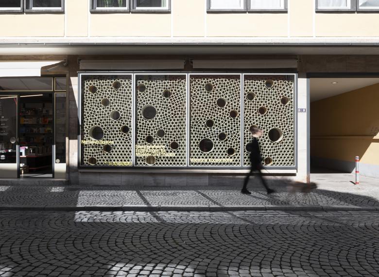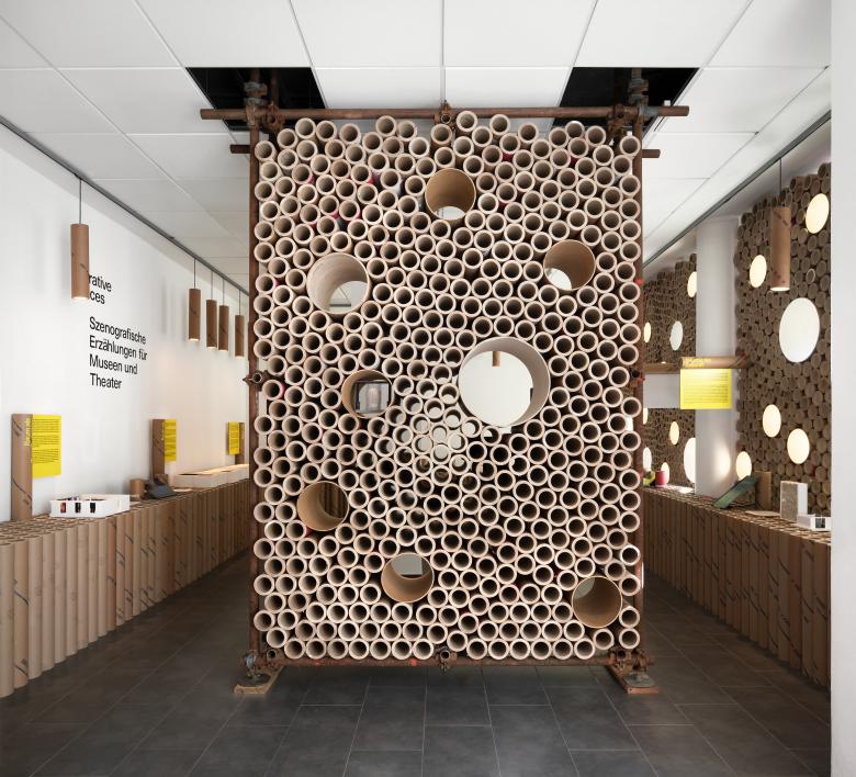 Statt neu produzierte Materialien zu verwenden, greift die Ausstellung bewusst auf bestehende Ressourcen zurück. Pappröhren aus einer lokalen Druckerei, die sonst Abfall wären, bilden die tragende Struktur der Inszenierung. Nach der Laufzeit erhalten sie eine neue Nutzung, etwa im Möbelbau, in Schaufenstern oder Kindergärten. Die Vision, Materialien nicht zu entsorgen, sondern weiterzudenken, wurde konsequent realisiert – nichts blieb übrig, alles fand eine neue Form.