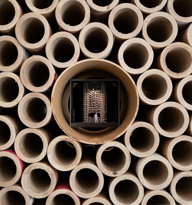 Diese experimentelle, forschende Entwurfsstrategie, die gefundene, aussortierte Materialien als Ausgangspunkt nimmt, eröffnet unvorhergesehene gestalterische Spielräume. Anstelle einer festgelegten Form entfaltet sich der kreative Prozess im Dialog mit dem Vorhandenen. So entstehen räumliche Strukturen, die sowohl die Materialität als auch die konzeptuelle Idee in einem vielschichtigen Zusammenspiel reflektieren.