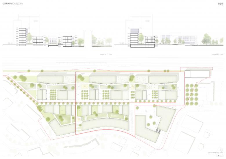 Auf dem ehemaligen Güterbahnhofareal in Renens, in der boomenden Agglomeration Lausanne West, ensteht ein neuer Stadtteil mit Wohnungen, Schulräumen, Gewerbe und Büros. Eine zentrale Achse in der Verlängerung des Avenue du Silo strukturiert das neu entstehende Stadtfeld und bindet es an den Bahnhof an. Die Freiraumachse nimmt die übergeordnete Langsamverkehrsverbindung in Form eines mit einer Baumreihe ausgezeichneten Veloweges auf. Ergänzt wird das Freiraumangebot durch halböffentliche Freiräume, die sich parallel zur Hauptachse als grüne Bänder durch das gesamte Areal erstrecken.