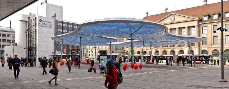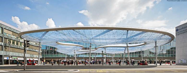 Ein zentraler Bushof auf dem Bahnhofplatz konzentriert neu alle Busse südlich der Bahnhofstrasse. Wie eine Waldlichtung spannt sich dort das filigrane, im Zentrum offene Luftkissendach über den Platz. Es schützt die Passanten, lässt aber genügend Luft, damit der Aufenthaltsbereich nicht wie eine geschlossene Halle wirkt.